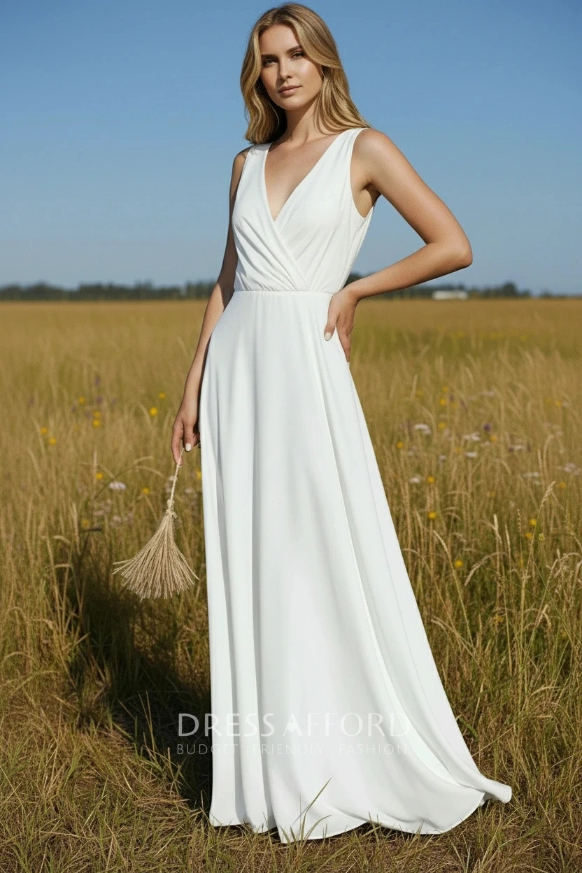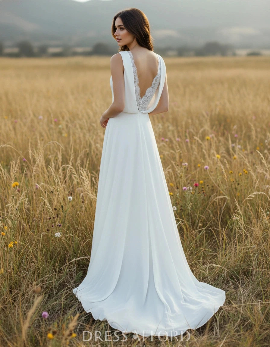 This elegant wedding dress features a sleek, sleeveless design with a dramatic low back, accentuated by delicate lace. Set in a field of wildflowers against a soft-focus landscape, it offers a serene and romantic look. Ideal for an outdoor ceremony, it combines simplicity with a touch of sensual elegance.