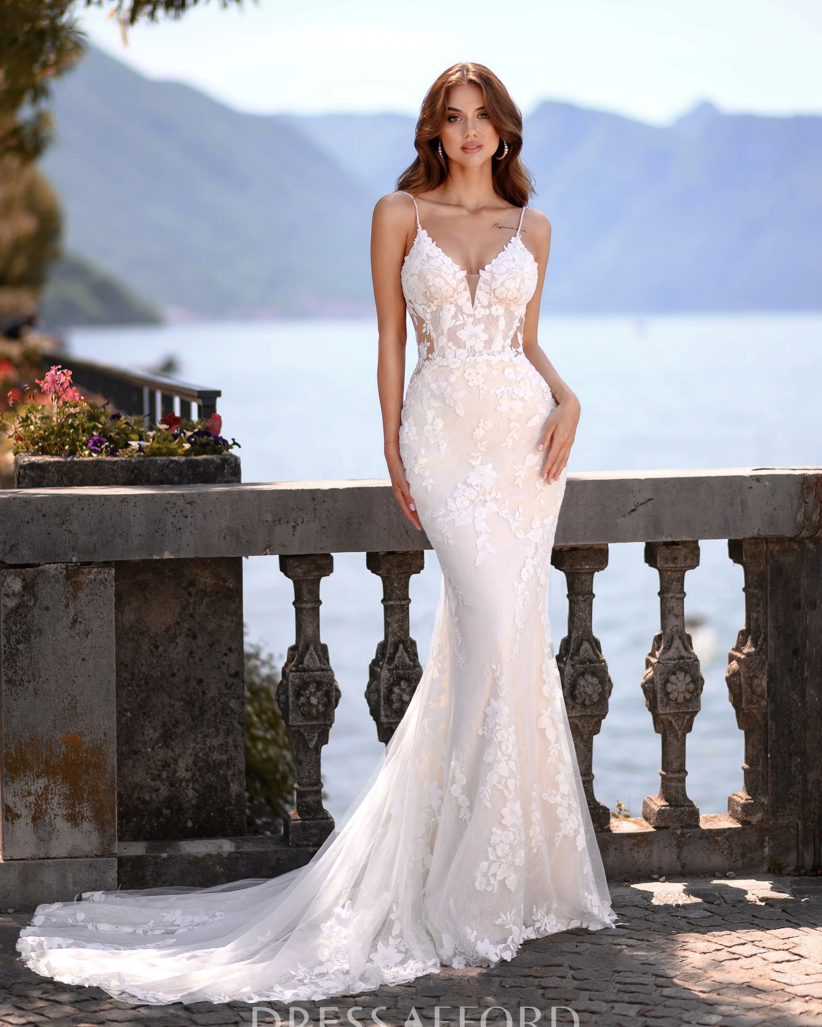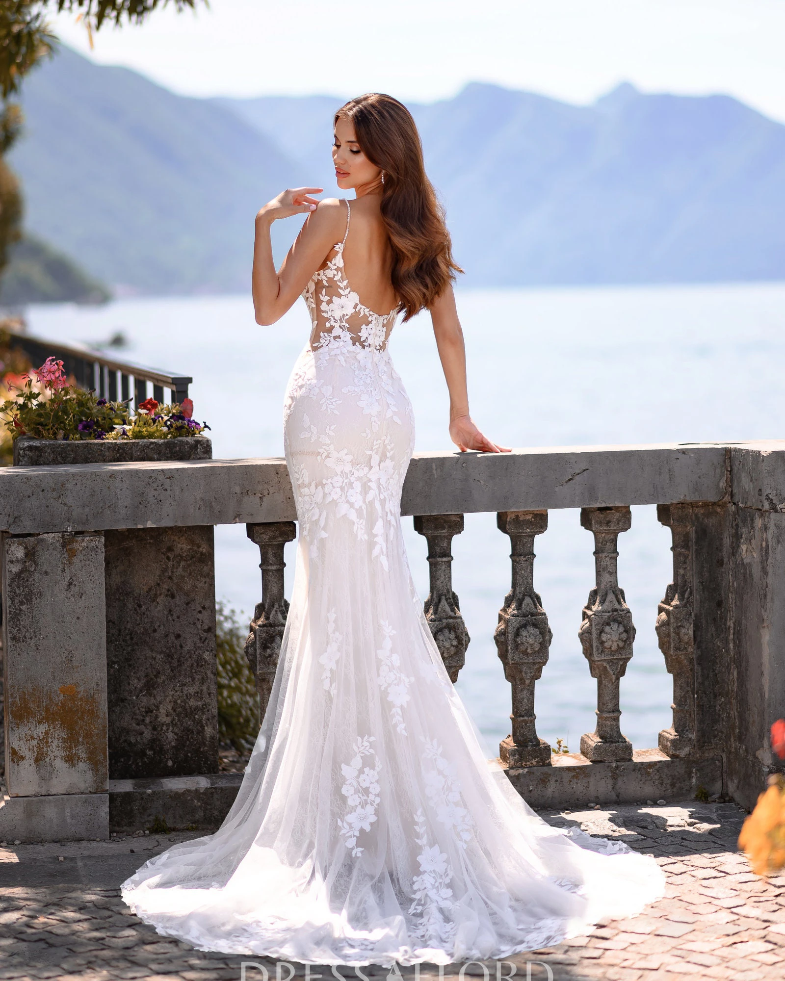 Lace Mermaid Spaghetti Elegant Applique Wedding Dress with Court Train