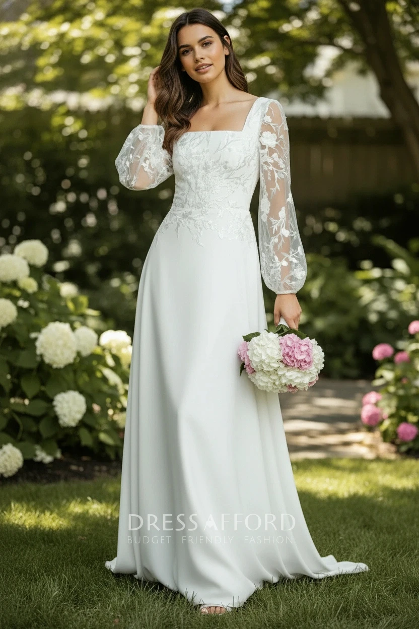 This elegant dress boasts puff sleeves, a lace bodice, and a full skirt, accessorized with a pink and white flower bouquet. Set in a vibrant garden with blooms and greenery, it creates a romantic and festive atmosphere. Ideal for a garden wedding or special occasion, it highlights feminine grace.