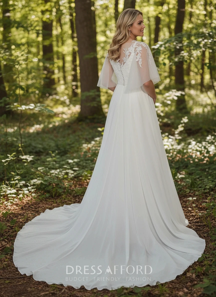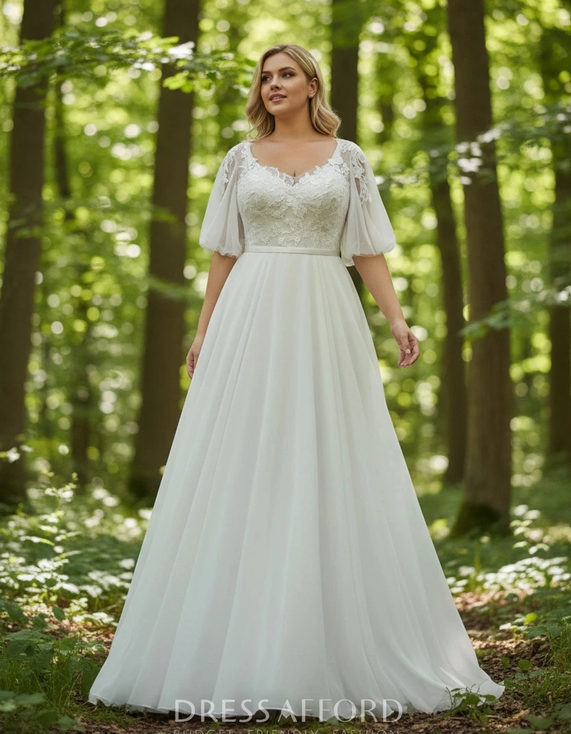 This romantic garden dress features short puff sleeves, a lace bodice, and a flowing tulle skirt. Worn in a forest with tall trees and sunlight, it offers a whimsical and elegant vibe. Perfect for a garden party or outdoor wedding, it combines vintage charm with natural beauty.