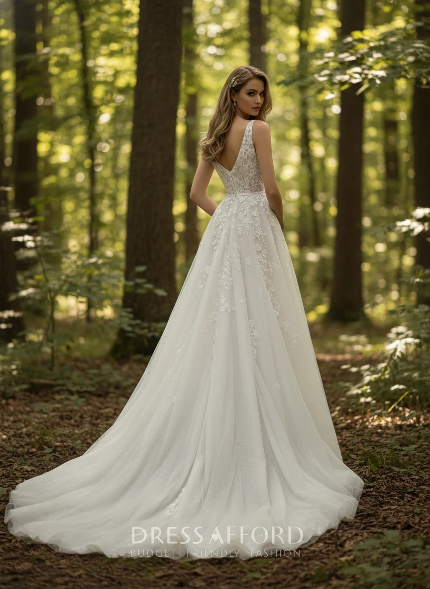 This elegant wedding dress features a V-neckline, lace detailing on the bodice, and a lightweight tulle skirt. Photographed in a lush green forest with soft light, it creates a peaceful and romantic ambiance. Ideal for a forest wedding, it emphasizes grace and natural beauty in a serene environment.